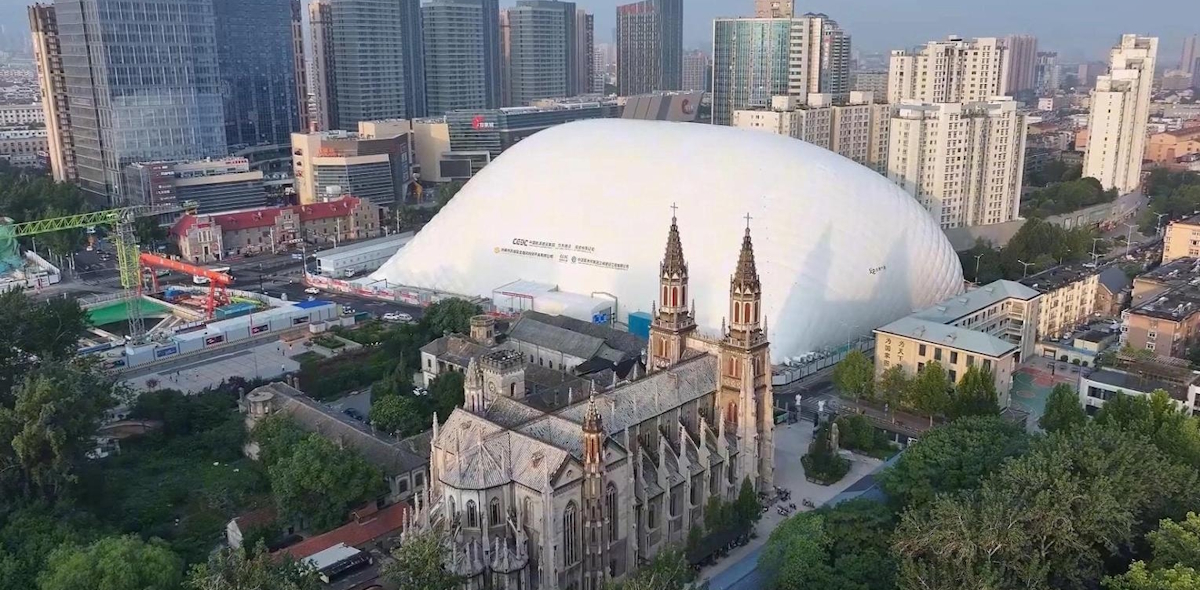 Another remarkable case can be found in Jinan, where this technology has been applied to a major urban project using an inflatable dome reaching approximately 50 meters in height and covering close to 20,000 square meters. At this scale, the enclosure becomes not only a construction management tool but also an urban landmark in itself, visible from multiple points across the city.